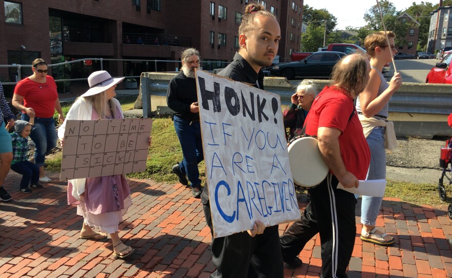 PORTLAND, Maine -- Ivan Marrinson marched with other labor advocates and workers through downtown Portland on Monday while holding a sign saying "Honk if You Are a Caregiver."