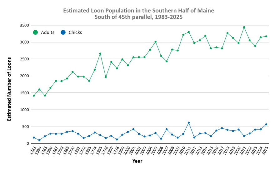 Based on the 2025 data collected by volunteers and staff, Maine Audubon estimates the population of adult loons in the southern half of the state is approximately 3,174, and the number of chicks to be 568. Population estimates are currently available for the bottom half of the state, south of the 45th parallel, where Maine Audubon has enough counters to produce reliable data.
