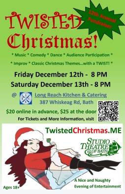 Studio Theatre of Bath presents the 12th Annual Twisted Christmas Fundraiser on December 12th and 13th at 8 PM, at Long Reach Kitchen & Catering at 387 Whiskeag Road. This variety show is for adults only and presents music, comedy, dance, improv, audience participation & classic Christmas themes with a twist. STB President Kirstin Hayward adds, "Twisted Christmas has become a new holiday tradition for hundreds of audience members for more than a decade."