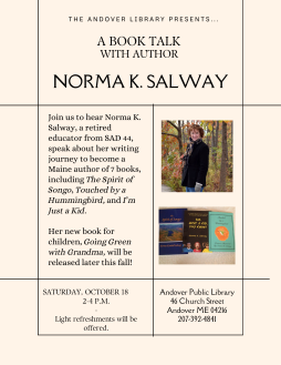 Join us to hear Norma K. Salway, a retired educator from SAD 44, speak about her writing journey to become a Maine author of 7 books, including The Spirit of Songo, Touched by a Hummingbird, and I'm Just a Kid.