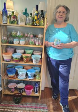 "Favorite Hobbies" includes everyday items hand painted to reflect the artist’s favorite hobbies: “Reading, gardening, painting, and a nice glass of wine,” explains Paula Horton. Paula hand paints bottles with floral and nature designs, adding lights to create a lamp that is perfect for a cozy reading nook or to add a soft glow to a room. She has been painting since 2005, and explains now that she’s retired, she “has the gift of time to enjoy my hobbies.”