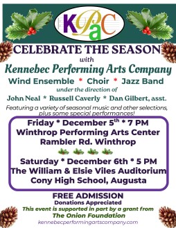 The evening will conclude with the KPAC Jazz Band, led by new director Russell Caverly, performing lively arrangements of familiar holiday tunes. The program will also include a commissioned work by Terry White, a noted Maine music educator, composer, arranger, and bandleader in the Portland area for more than 34 years.