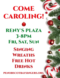 Come Caroling! Join us for an afternoon and evening of Community Caroling in the Reny's Plaza Belfast Parking lot. Sing along! Grab a wreath for your front door. Free hot drinks, coffee, cocoa, tea.