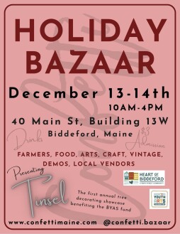 Biddeford’s original Bazaar. A fun and festive way to support local small businesses this holiday season. Shop a truly unique collection of over 90 Maine vendors. Arts, craft, food, music and community. This year Confetti and the Heart of Biddeford are presenting Tinsel, a bright and joyful holiday tree showcase to benefit the Biddeford Youth’s Art Scholarship Fund.