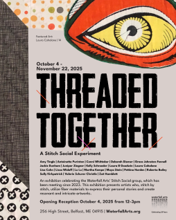 BELFAST, ME — Waterfall Arts is proud to present Threaded Together: A Stitch Social Experiment, on view from October 4 through November 21, 2025. The exhibition celebrates the artists of Stitch Social, a twice-monthly fiber arts community group that began in early 2023 and has become a vibrant thread in the tapestry of Waterfall Arts.