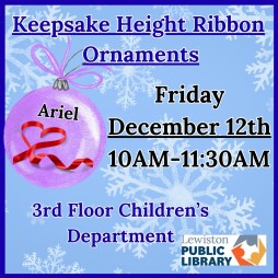 Friday, December 12th at 10am the Lewiston Public Library Children’s Department will be offering the program Keepsake Height Ribbon Ornaments!