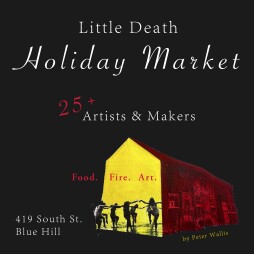 This is our first annual Little Death Holiday Market. Located inside/outside an old Maine barn. Our focus is on highlighting emerging artists in non-traditional ways. Prices range from $5 to $300 with everything from textiles to prints to ceramic sculptures, to handmade ornaments. Come out to discover and support artists from the community—your community! Over 25 vendors. Fire, food, and art— what more can you want on a Maine December day.