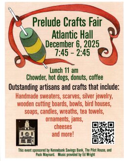 Annual Christmas Fair. Outstanding artisans and crafts that include hand made sweaters, scarves, silver jewelry, wooden cutting boards, bird houses, jams, cheeses and more ! Lunch 11:00 am: chowder, hot dogs, donuts and coffee. All to benefit historic Atlantic Hall