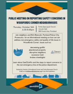 Join neighbors and city staff Rich Bianculli, Portland Police City Prosecutor for an informational meeting on how we can address non-emergency safety and quality of life issues in Woodfords Corner, such as decreasing graffiti, abandoned property, disruptive neighbors, excessive trash, broken streetlights, etc. Learn about SeeClickFix and the steps to report concerns to the non-emergency line at the police department. Hosted by Friends of Woodfords Corner and Trinity Episcopal Church. Email us at info@woodfordscorner.org if you have questions.