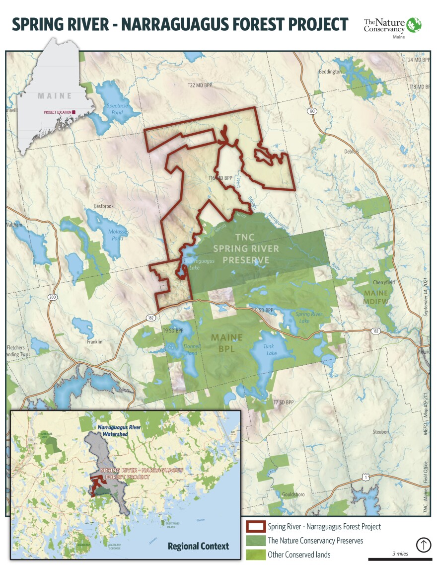 The Nature Conservancy in Maine has announced the purchase of more than 13-thousand forested acres in the Narraguagus River watershed in Hancock County west of Cherryfield. The acquisition expands TNC's nearly ten-thousand acre Spring River Preserve for a total of 23,500 acres. Forest Program Director Mark Berry says the project was a priority because it achieves a scale of conservation that will provide meaningful biodiversity.